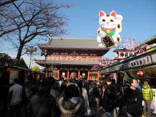 仲見世には招き猫なども登場して盛り上がっています。浅草と言えば観音様、観音様と言えば仲見世を通って行くのが正規の参道。昔から参拝客の多い社寺仏閣は参道に店が並ぶのが常です。