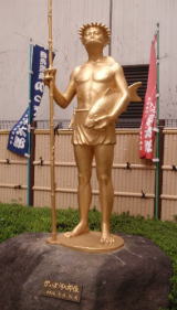 商店街の人たちが河童の話を伝えながら、その記念にしようと作った河童の像です。なぜ金色かは分かりません。